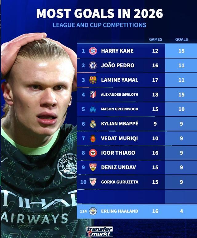 世界杯官网-哈兰德2026年16场只打进4球,同期凯恩12场15球全欧第1